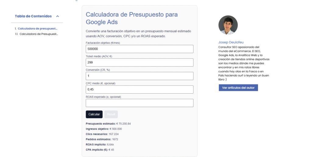 Calculadora de presupuesto y ROAS para Google Ads para establecer correctamente la inversión a trabajar.