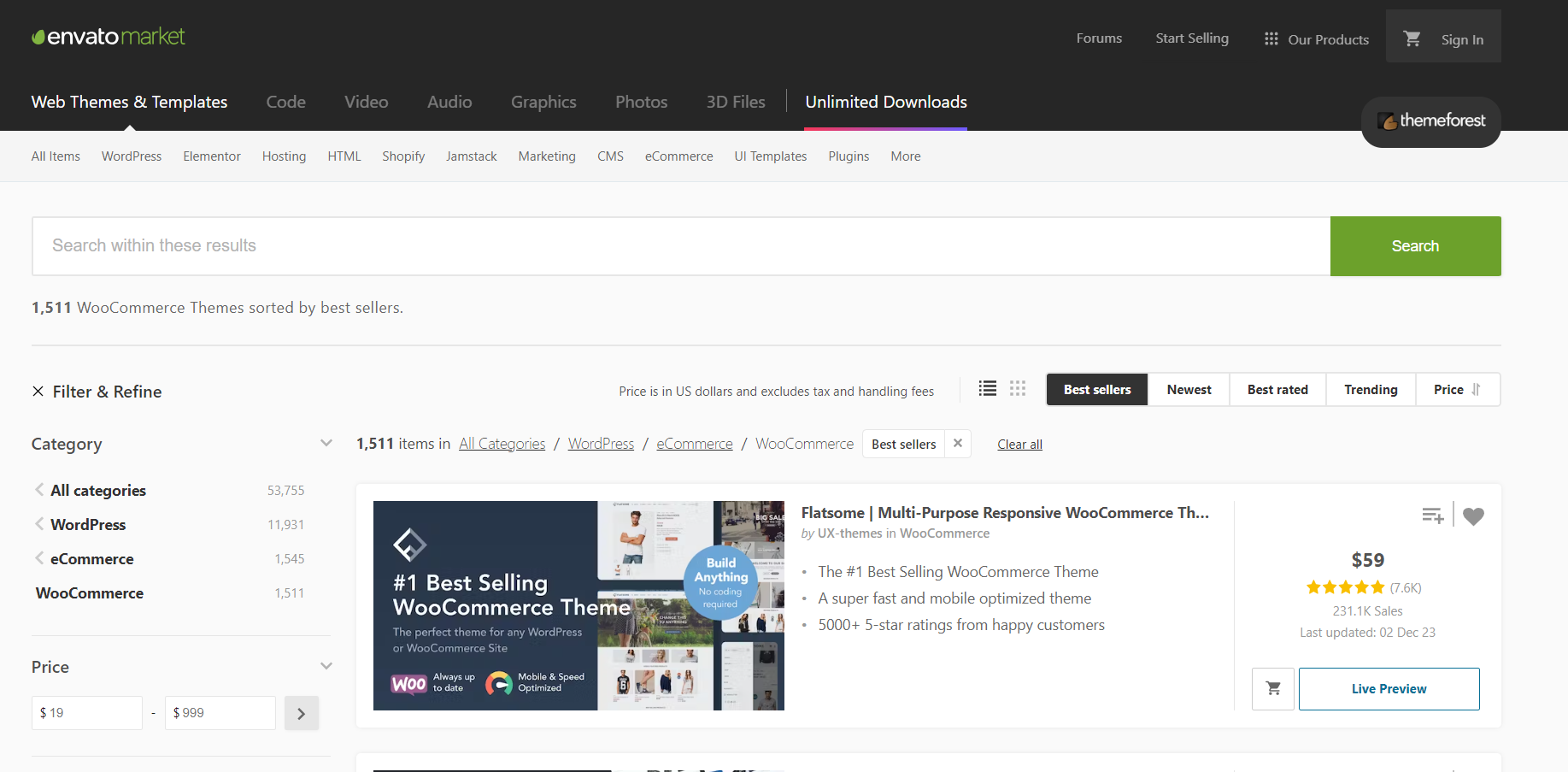 Otro sitio web que ofrece más de 1500 temas de WooCommerce es ThemeForest .
